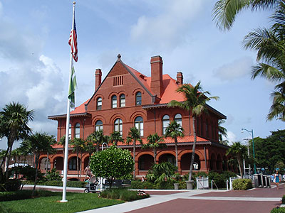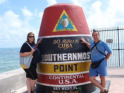 Po 275km jízdy jsme konečně u cíle. Ačkoliv by se to podle názvu mohlo zdát, Key West není nejzápadnějším ostrovem celého souostroví, ale posledním, na který vede silnice. Dál už se dá pokračovat jenom lodí. Na rohu Whitehead a South Street stojí tento pomník označující nejjižnější bod kontinentálních USA. Turisté se tu hojně fotí a při tom zapomínají, že už dávno nejsou na pevnině, ale na ostrově. Navíc nejjižnější bod ostrova Key West stejně leží ještě kousek dál v areálu tamní pevnosti. Úplně nejpřesnější není ani vzdálenost od Kuby - ta nečiní 90 nýbrž 94,5 mil :-)
