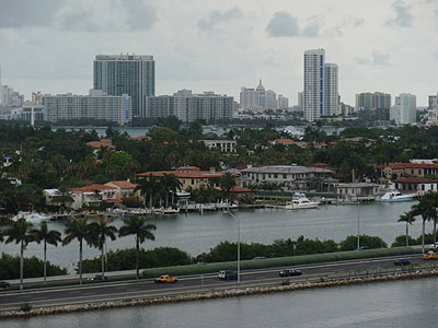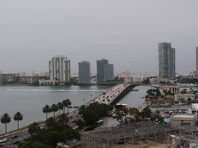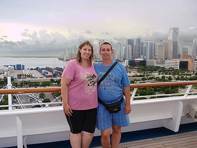 Odpoledne jsme vrátili auto a shutle bus z půjčovny nás zadarmo odvezl až do přístavu. Tam jsme nastoupili na loď Valor společnosti Carnival. Z 11. paluby se nám naskytl nádherný výhled na miamské mrakodrapy, tak jsme se s nimi hned nechali zvěčnit.   Z obrovské lodi byly opravdu nádherné výhledy. Za McArthur Causeway (silnice vedoucí kolem přístavu po hrázi) byla nádherně vidět silueta Miami Beach. Dokonce jsme v dálce objevili hotel Royal Palm (uprostřed snímku s věžičkou), který stál naproti našemu hotelu Tropics.