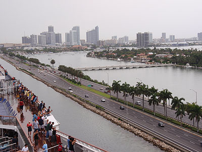 V 16 hodin konečně vyplouváme na moře. Kolem jedoucí auta troubí, blikají a lidé ze břehu i z lodě na sebe mávají, jako by odjezd obří lodě byl tou nejvýznamnější událostí letošního roku. Euforickou náladu nemůže pokazit ani dešťová přeháňka, která nás právě začala zkrápět.   Míjíme nejižnější výběžek Miami Beach a most, po kterém jsme i my několikrát přejížděli. Před námi je teď celodenní plavba k severozápadnímu pobřeží Kuby, kde u mysu San Antonio, který mimochodem uvidíme na obzoru, vplujeme do Karibského moře.